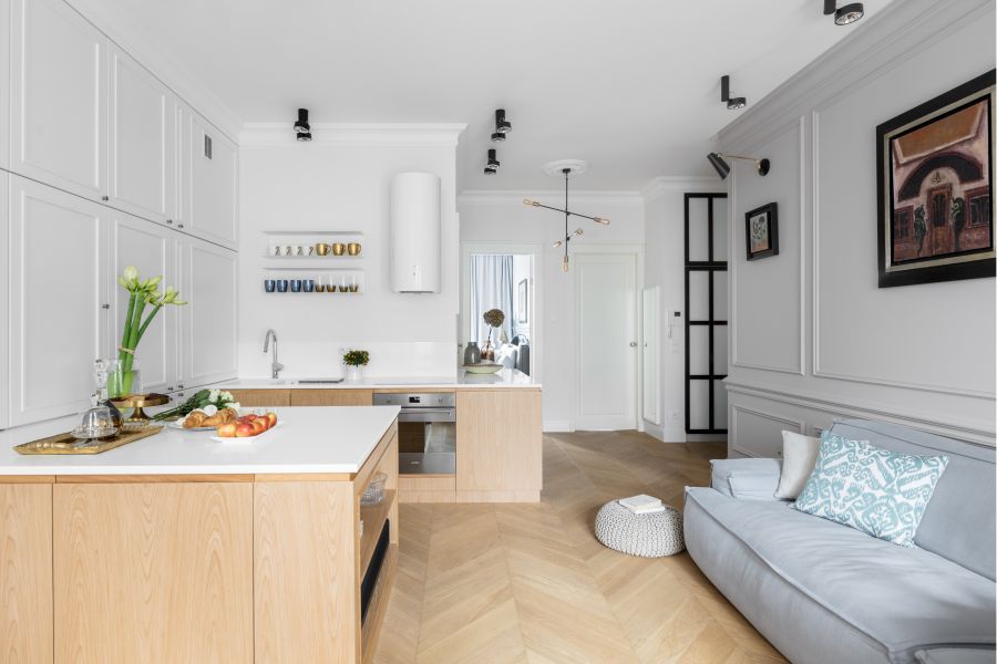 Dzięki dobrze zaprojektowanej przestrzeni, mieszkanie udało się dobrze doświetlić korzystając zaledwie z dwóch istniejących okien. Białe ściany ozdobione sztukaterią w połączeniu z drewnianą podłogą w jodełkę potęgują klimat tego miejsca. Kuchenna wyspa wkomponowuje się w przestrzeń salonową i na pierwszy rzut oka aż trudno zauważyć, że jest to miejsce, gdzie przygotowuje się posiłki. Łazienka stanowi część sypialni, światło wpada do niej przez duże przeszklenie od sufitu, po samą podłogę. W sypialni uwagę przykuwa niebieska lamperia, która nadaje pomieszczeniu artystycznego charakteru. Mieszkanie urządzono w klasyczny sposób z przewagą uniwersalnej bieli, pastelowych kolorów i drewna. Do neutralnych barw dobrano piękne obrazy w złotych i czarnych ramach, które stanowią efektowną dekorację mieszkania.