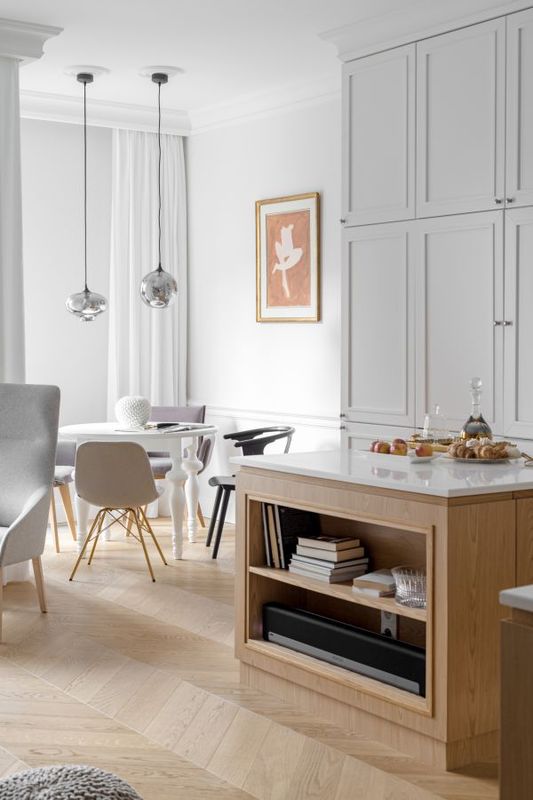 Dzięki dobrze zaprojektowanej przestrzeni, mieszkanie udało się dobrze doświetlić korzystając zaledwie z dwóch istniejących okien. Białe ściany ozdobione sztukaterią w połączeniu z drewnianą podłogą w jodełkę potęgują klimat tego miejsca. Kuchenna wyspa wkomponowuje się w przestrzeń salonową i na pierwszy rzut oka aż trudno zauważyć, że jest to miejsce, gdzie przygotowuje się posiłki. Łazienka stanowi część sypialni, światło wpada do niej przez duże przeszklenie od sufitu, po samą podłogę. W sypialni uwagę przykuwa niebieska lamperia, która nadaje pomieszczeniu artystycznego charakteru. Mieszkanie urządzono w klasyczny sposób z przewagą uniwersalnej bieli, pastelowych kolorów i drewna. Do neutralnych barw dobrano piękne obrazy w złotych i czarnych ramach, które stanowią efektowną dekorację mieszkania.